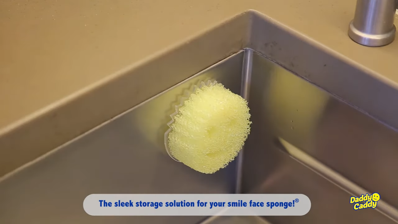 Daddy Caddy is the sleek storage solution for your smiley face sponge. The low profile design makes Daddy Caddy the perfect addition to sinks of any size. Dual suction caps ensure a secure hold to any smooth, clean surface.